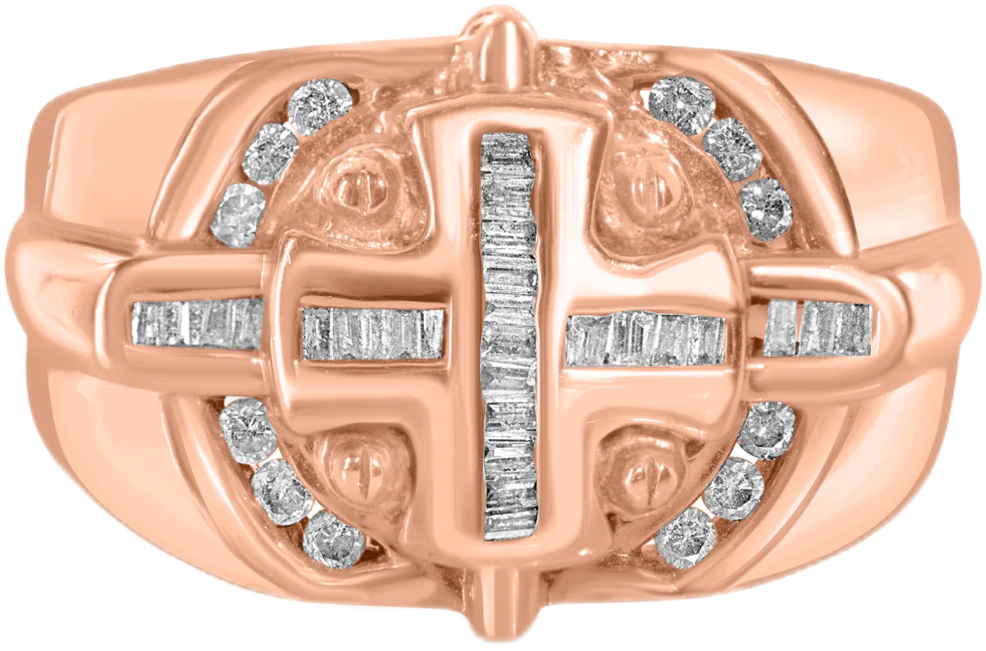 Command attention with this bold and luxurious ring crafted from 18K rose gold. Weighing 15 grams, it features a distinctive geometric design set with a stunning combination of round and baguette-cut diamonds. A true statement piece that blends modern artistry with timeless elegance—perfect for those who wear power with style.